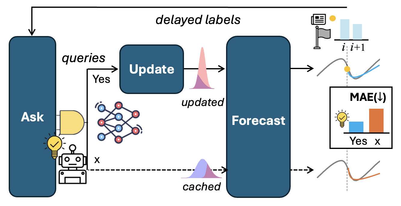 Language-Agent Forecasting with World-Model Surrogates under Delayed Feedback